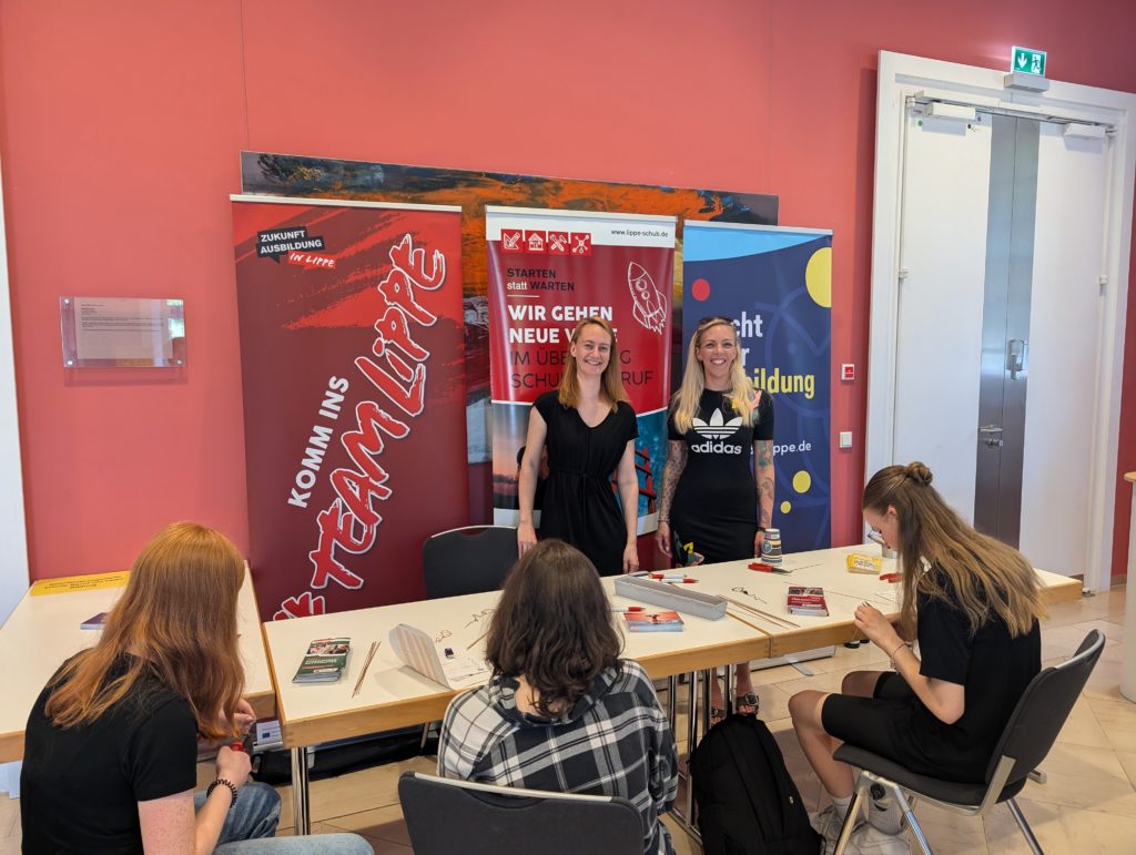 Am 26. Juni 2024 fand wieder die Mädchenmesse in der Stadthalle in Detmold statt. Auch die Koordinierungsstelle Schule-Beruf (Schu.B) war mit dabei. Die Kolleginnen standen für Fragen rund um die Berufsorientierung zur Verfügung und haben vielen interessierten Jugendlichen einen Einblick in meist noch frauenuntypische Berufsbilder gegeben.