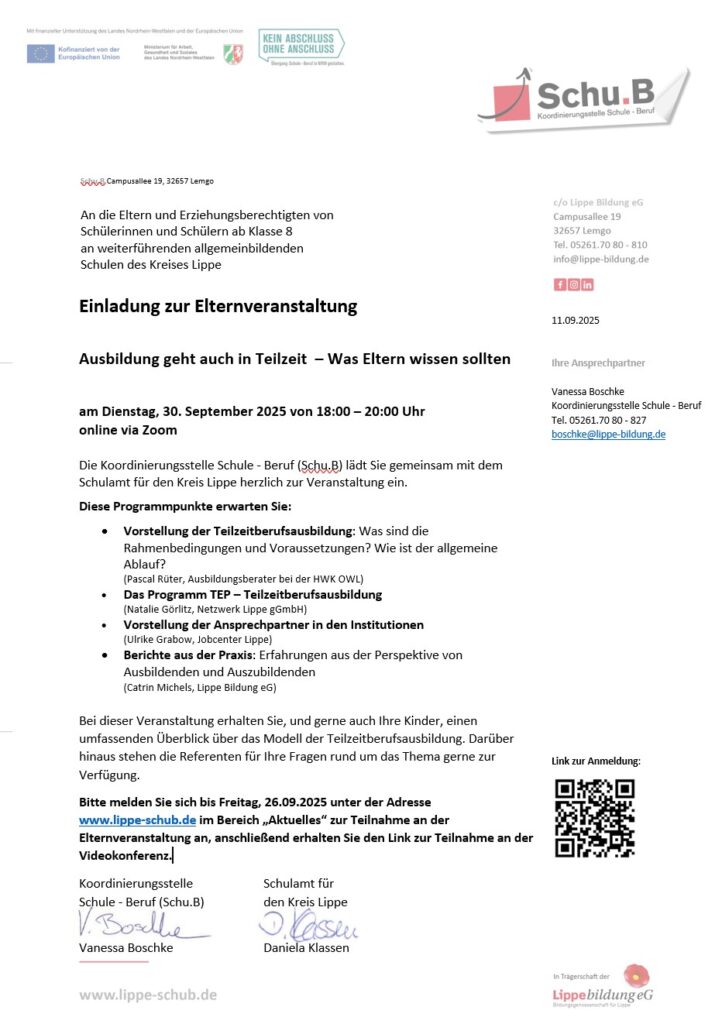 Elternveranstaltung am 30.09.2025: Ausbildung geht auch in Teilzeit