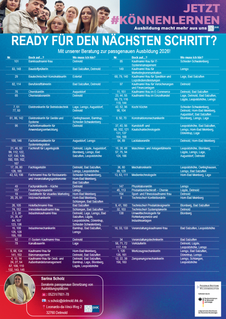 Der Countdown läuft – für das Ausbildungsjahr 2026 gibt es in Lippe noch zahlreiche spannende Ausbildungsplätze. Unternehmen aus Industrie, Handel, Dienstleistung und Handwerk suchen aktuell noch motivierte Auszubildende und bieten vielfältige Einstiegsmöglichkeiten in das Berufsleben.