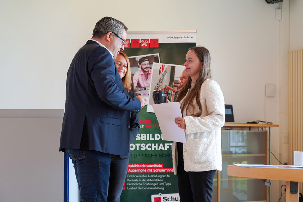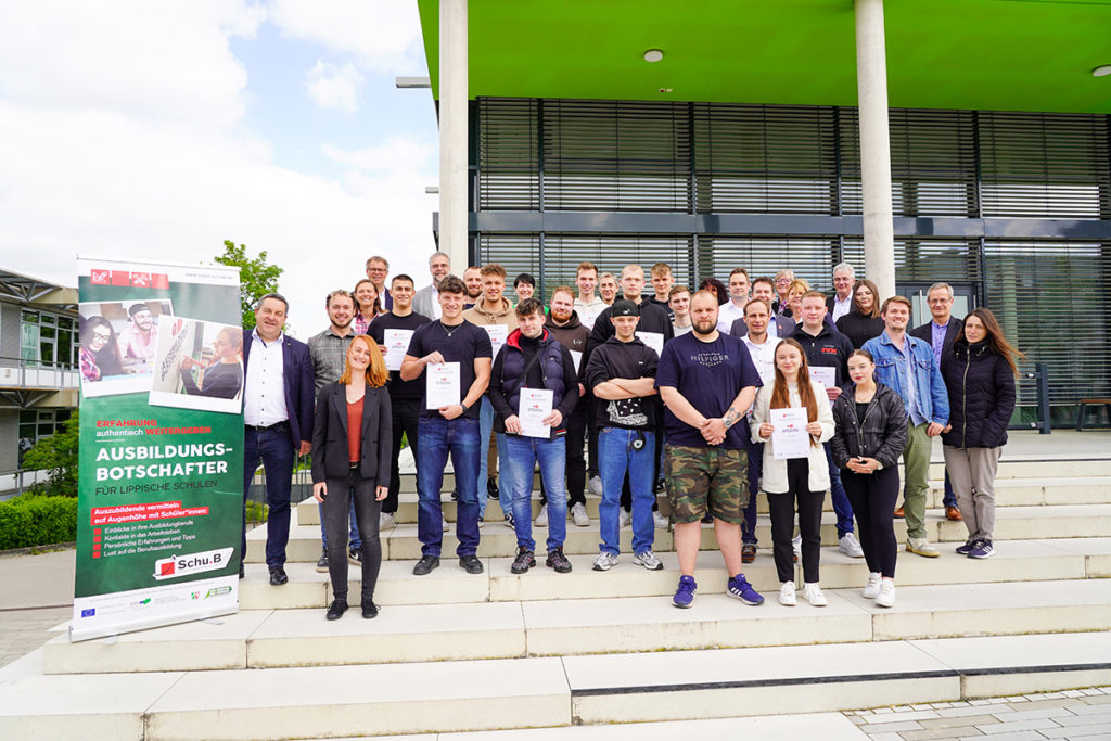 Im Kreis Lippe sind seit 2011 Ausbildungsbotschafter im Einsatz: Aus ihrem eigenen Alltag vermitteln Auszubildende und dual Studierende den Schülerinnen und Schülern auf Augenhöhe Einblicke in weniger bekannte, aber zukunftsträchtige Berufe sowie erste Kontakte ins Arbeitsleben.