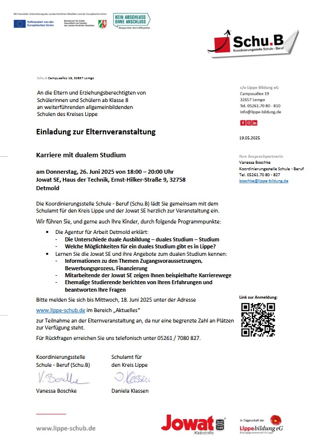 Die Koordinierungsstelle Schule – Beruf (Schu.B) lädt Sie gemeinsam mit dem Schulamt für den Kreis Lippe und der Jowat SE herzlich zur Veranstaltung ein: